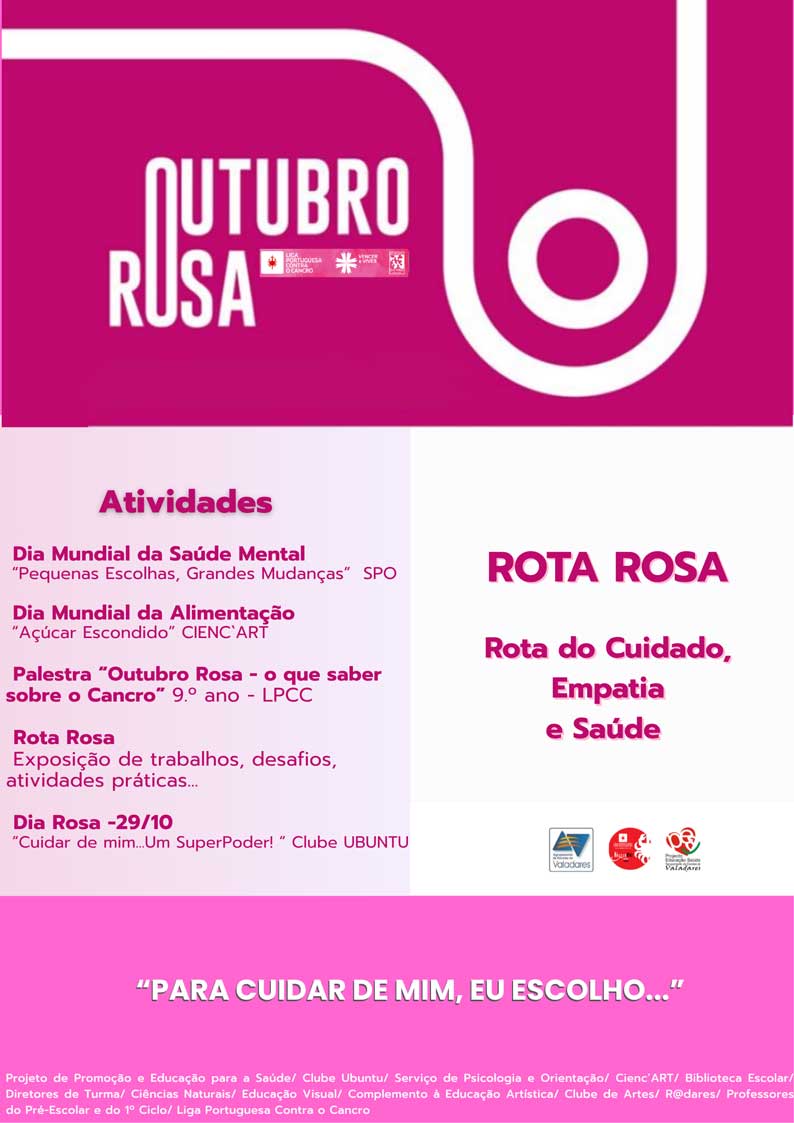 Outubro é o mês da saúde e da prevenção e na nossa Escola a Rota Rosa já começou a inspirar a comunidade educativa com a narrativa “Para cuidar de mim, eu escolho…”. A viagem iniciou-se na Estação da Saúde Mental, dinamizada pelo Serviço de Psicologia e Orientação (SPO), com a atividade “Pequenas escolhas, grandes mudanças” que desafiou os alunos a refletirem sobre hábitos e atitudes que fazem a diferença no seu bem-estar. A R@dares tem acompanhado o percurso, promovendo momentos de partilha, música e mensagens positivas.